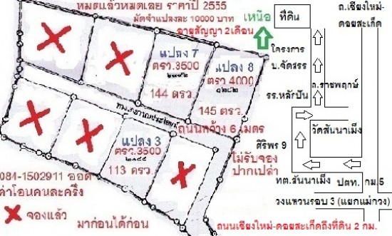 ขายที่ดิน1งานกว่า 3 แปลงสุดท้าย ตรว.ละ3500 (2แปลง),ตรว.ละ4000(1แปลง) เขตเทศบาลสันนาเม็ง สันทราย เชียงใหม่ ทางสาธารณะกว้าง 6 เมตร 0841502911(ออด) ค่าโอนคนละครึ่ง มัดจำแปลงละ 10000 บาท มาก่อนได้ก่อน หมดแล้วหมดเลย ไม่รับจองปากเปล่า