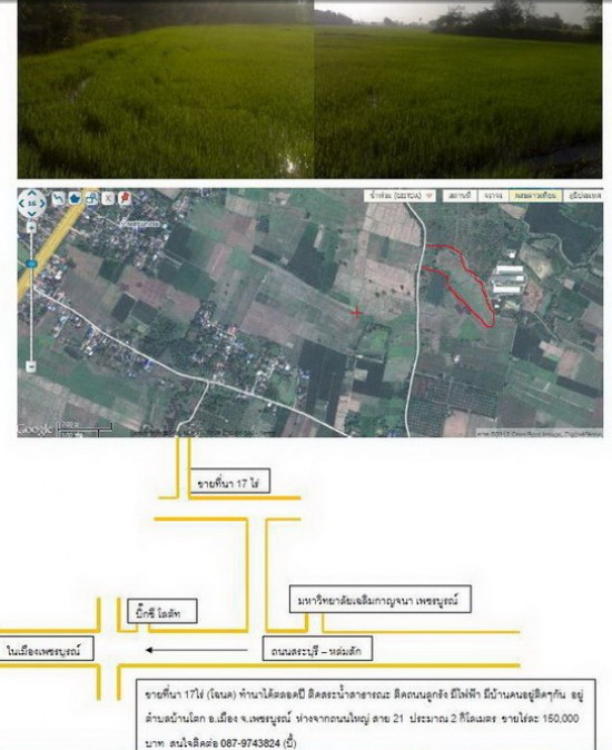 ขายที่นา 17ไร่ (โฉนด) ทำนาได้ตลอดปี ติดสระน้ำสาธารณะ ติดถนนลูกรัง มีไฟฟ้า มีบ้านคนอยู่ติดๆกัน อยู่ตำบลบ้านโตก อ.เมือง จ.เพชรบูรณ์ ห่างจากถนนใหญ่ สาย 21 ประมาณ 2 กิโลเมตร ขายไร่ละ 150,000 บาท สนใจติดต่อ 087-9743824 (บี้)