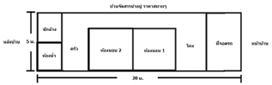 กว้าง 5 เมตร ยาว 20 เมตร 2 ห้องนอน 1 ห้องน้ำ มีที่จอดรถ ราคา 850,000 บาท