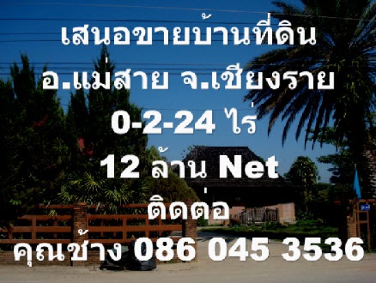 เสนอขายบ้านพร้อมที่ดิน ซอยตรงข้าม ที่ทำการอำเภอแม่สาย จ.เชียงราย 0-2-24 ไร่ ขายเหมา 12ล้านบาท อ่านต่อที่ http://crwmkt.blogspot.com/2012/02/0-2-24-12.html