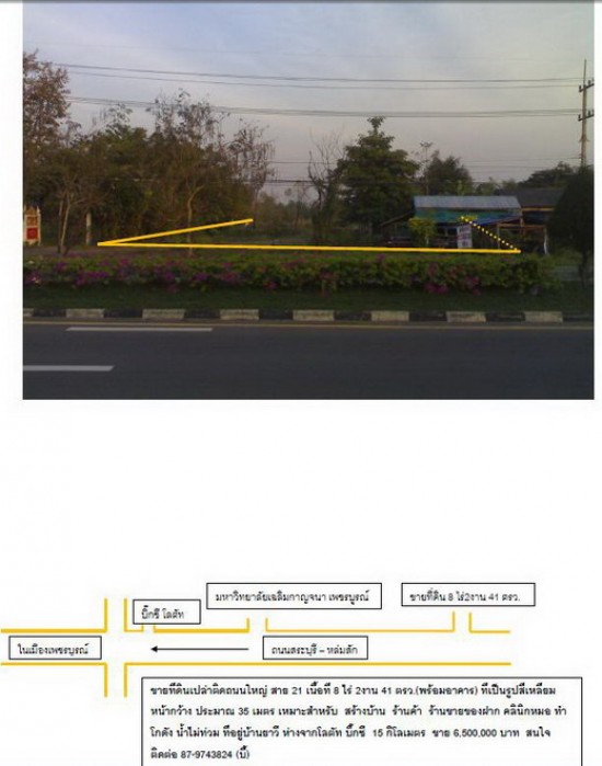 ขายที่ดินเปล่าติดถนนใหญ่ สาย 21 เนื้อที่ 8 ไร่ 2งาน 41 ตรว.(พร้อมอาคาร) หน้ากว้าง ประมาณ 35 เมตร เหมาะสำหรับ สร้างบ้าน ร้านค้า ร้านขายของฝาก คลินิกหมอ ทำโกดัง น้ำไม่ท่วม ที่อยู่บ้านยาวี ห่างจากโลตัท บิ๊กซี 15 กิโลเมตร ขายยกแปลง 6,500,000 บาท สนใจติดต่อ 87-9743824 (บี้)