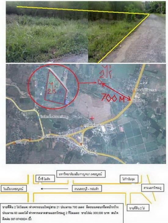 ขายที่ดิน 2 ไร่(โฉนด) ห่างจากถนนใหญ่สาย 21 ประมาณ 700 เมตร ติดถนนคอนกรีตหน้ากว้าง ประมาณ 60 เมตรได้ ห่างจากตลาดสามแยกวังชมภู 2 กิโลเมตร ขายไร่ล่ะ 300,000 บาท สนใจติดต่อ 087-9743824 (บี้)