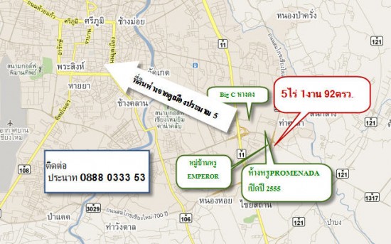 ใกล้กับ ห้าง Big C, ห้างหรู Promenada ที่จะเปิดใหม่ในปี2555นี้ ที่สวยมาก ติดถนนทั้งด้านหน้า และหลัง ถนนสมโภชเชี่ยงใหม่700ปี ต.ท่าศาลา อ.เมือง ที่รูปสี่เหลี่ยม จำนวน 5ไร่ 1งาน 92 ตารางวา ราคาตารางวาละ 25,000 บาท ( 54.8ล้านบาท )