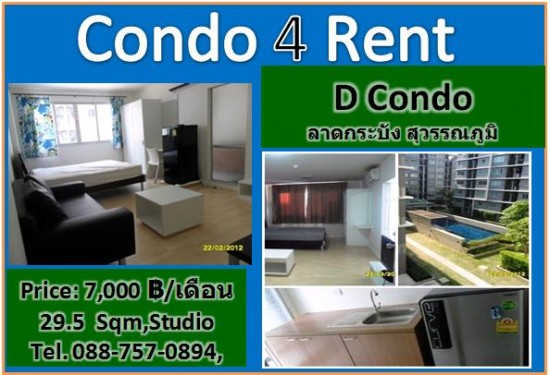 ให้เช่า ดี คอนโด D-condo ลาดกระบัง สุวรรณภูมิ อ.A วิวสระน้ำ ว่างพร้อมอยู่ มีเฟอร์ ทีวี ตู้เย็น