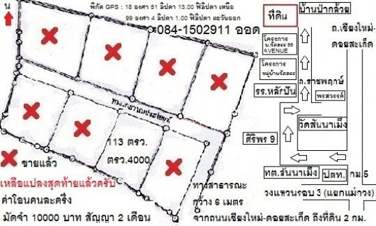 ขายที่ดินราคาถูกเจ้าของขายเอง เหลือแปลงสุดท้ายแล้วครับ 1 งาน 13 ตรว.ตรว.ละ 4,000 บาท ทางสาธารณประโยชน์ กว้าง 6 เมตร เขตเทศบาลสันนาเม็ง อ.สันทราย จ.เชียงใหม่ 084-1502911(ออด) ค่าโอนคนละครึ่ง มัดจำแปลงละ10,000 บาท สัญญา 2 เดือน มาก่อนได้ก่อน
