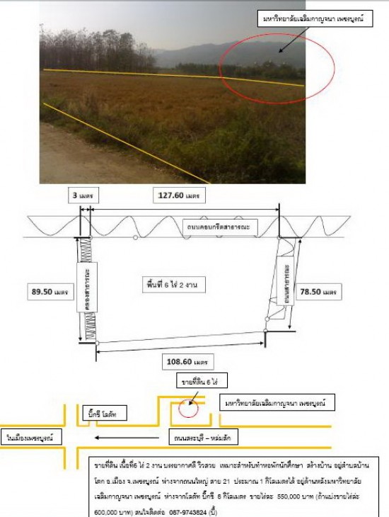 ขายที่ดิน เนื้อที่6 ไร่ 2 งาน บรรยากาศดี วิวสวย เหมาะสำหรับทำหอพักนักศึกษา สร้างบ้าน อยู่ตำบลบ้านโตก อ.เมือง จ.เพชรบูรณ์ ห่างจากถนนใหญ่ สาย 21 ประมาณ 1 กิโลเมตรได้ อยู่ด้านหลังมหาวิทยาลัยเฉลิมกาญจนา เพชรบูรณ์ ห่างจากโลตัท บิ๊กซี 8 กิโลเมตร ขายไร่ละ 550,000 บาท (ถ้าแบ่งขายไร่ล่ะ 600,000 บาท) สนใจติดต่อ 087-9743824 (บี้)