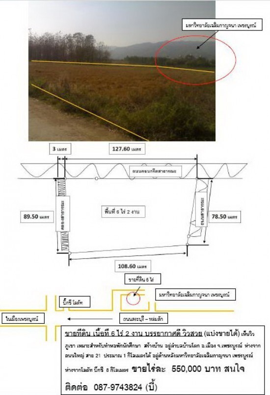 ขายที่ดิน เนื้อที่ 6 ไร่ 2 งาน บรรยากาศดี วิวสวย (แบ่งขายได้) เห็นวิวภูเขา เหมาะสำหรับทำหอพักนักศึกษา สร้างบ้าน อยู่ตำบลบ้านโตก อ.เมือง จ.เพชรบูรณ์ ห่างจากถนนใหญ่ สาย 21 ประมาณ 1 กิโลเมตรได้ อยู่ด้านหลังมหาวิทยาลัยเฉลิมกาญจนา เพชรบูรณ์ ห่างจากโลตัท บิ๊กซี 8 กิโลเมตร ขายไร่ละ 550,000 บาท สนใจติดต่อ 087-9743824 (บี้)