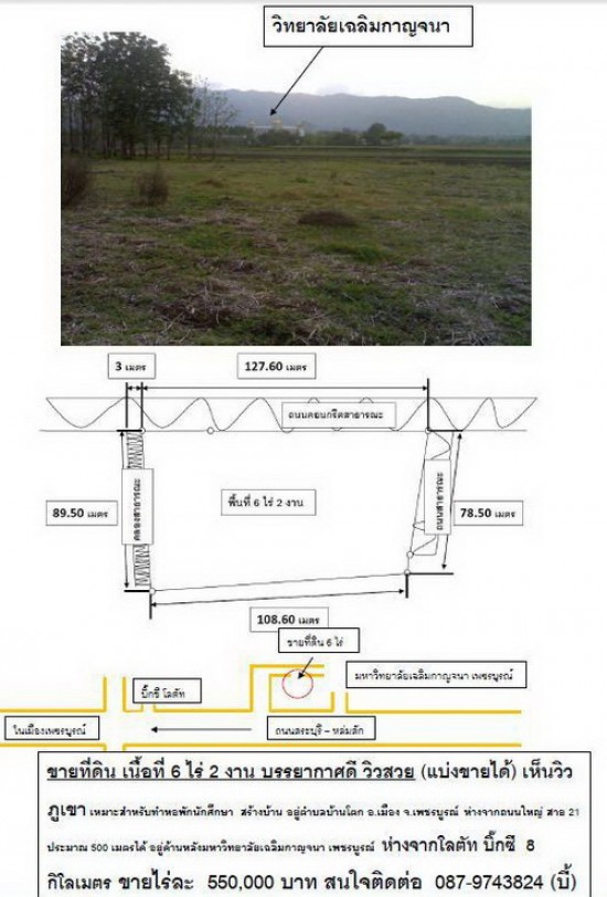 ขายที่ดิน เนื้อที่ 6 ไร่ 2 งาน บรรยากาศดี วิวสวย (แบ่งขายได้) เห็นวิวภูเขา เหมาะสำหรับทำหอพักนักศึกษา สร้างบ้าน อยู่ตำบลบ้านโตก อ.เมือง จ.เพชรบูรณ์ ห่างจากถนนใหญ่ สาย 21 ประมาณ 500 เมตรได้ อยู่ด้านหลังมหาวิทยาลัยเฉลิมกาญจนา เพชรบูรณ์ ห่างจากโลตัท บิ๊กซี 8 กิโลเมตร ขายไร่ละ 550,000 บาท สนใจติดต่อ 087-9743824 (บี้)