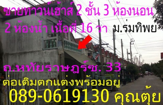 ขายทาวน์เฮ้าส์ 2 ชั้น 3 ห้องนอน 2 ห้องน้ำ เนื้อที่ 16 ตรว.แถมแอร์ 1 ตัว(ต่อเติมตกแต่งพร้อมอยู่ ขายราคา 950,000- (โอนให้) ทาวน์เฮ้าส์ตั้งอยู่หมู่บ้านร่มทิพย์ ถนนหทัยราษฏร์ ซอย 33 แขวงบางชัน เขตคลองสามวา กรุงเทพฯ การเดินทางสะดวกมีรถสองแถว,รถตู้,รถเมล์ ผ่าน มีห้างโลตัสเอกเพลสอยูหน้าหมู่บ้าน ใกล้ตลาดหทัยมิตรเพียง 1 กม. ห้างสรรพสินค้าใกล้เคียง ห้างบิ๊กซีเลียบคลองสอง,ห้างบิ๊กซีมีนบุรี,ห้างโลตัสมีนบุรี สถานการศึกษใกล้เคียง วิทยาลัยบริหารธุรกิจและการท่องเที่ยวอยู่ถนนเลียบคลองสอง,โรงรียนพาณิชย์มีนบุรี,โรงเรียนปรียากร,โรงเรียนนวมินทราชินูทิศเบญจมราชาลัย,โรงเรียนเจริญพัฒนาบริหารธุรกิจ,โรงเรียนอาชีวะเอกชนมีนบุรีโปโลเทคนิค สนใจ ติดต่อ คุณธีรภัทร (ตุ้ย) 089-0619130 หรือคุณอำนาจ 085-1946234 ดูรายละเอียดได้ที่เว็บไซต์http://www.tplandhouse.com ศูนย์บริการรับฝากขาย บ้าน ที่ดิน ขายฝาก ซื้อ เช่า โฆษณา รับถมที่ดิน ฟรีโฆษณา