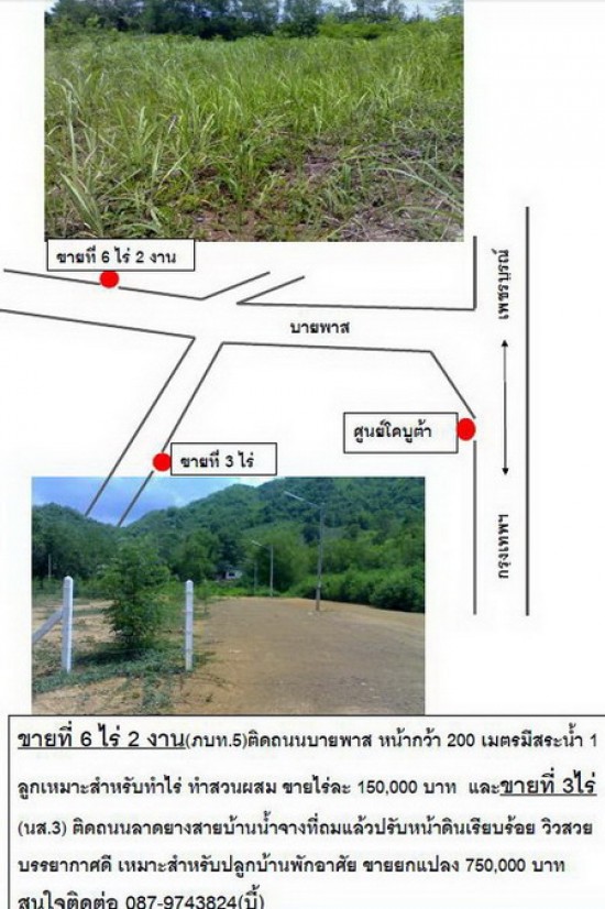 ขายที่ 6 ไร่ 2 งาน(ภบท.5)ติดถนนบายพาส หน้ากว้า 200 เมตรมีสระน้ำ 1 ลูกเหมาะสำหรับทำไร่ ทำสวนผสม ขายไร่ละ 150,000 บาท และขายที่ 3ไร่ (นส.3) ติดถนนลาดยางสายบ้านน้ำจางที่ถมแล้วปรับหน้าดินเรียบร้อย วิวสวยบรรยากาศดี เหมาะสำหรับปลูกบ้านพักอาศัย ขายยกแปลง 750,000 บาท สนใจติดต่อ 087-9743824(บี้)