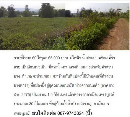 ขายที่โฉนด 60 ไร่ๆละ 65,000 บาท มีไฟฟ้า น้ำประปา พร้อม ที่วิวสวย เป็นลักษณะเนิน มีสระน้ำตรงกลางที่ เหมาะสำหรับทำส่วนยาง ทำเกษตรส่วนผสม ตรงข้ามกับที่แปลงนี้มีบ้านคน(ที่ทำส่วนยางพารา) ที่แปลงนี้อยู่สุดถนนคอนกรีต ห่างจากถนนดำ (ลาดยางสาย 2275) ประมาณ 1.5 กิโลเมตรแล้วห่างจากตัวเมืองเพชรบูรณ์ ประมาณ 30 กิโลเมตร ที่อยู่บ้านถ้ำน้ำบัง ต.วังชมภู อ.เมือง จ.เพชรบูรณ์