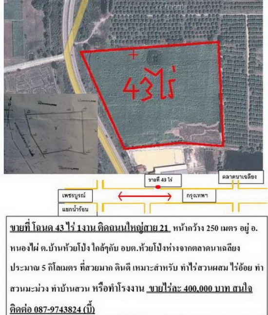 ขายที่ โฉนด 43 ไร่ 1งาน ติดถนนใหญ่สาย 21 หน้ากว้าง 250 เมตร