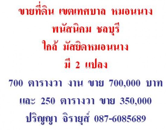 ขายที่ดิน เขตเทศบาล หมอนนาง พนัสนิคม ชลบุรีใกล้ มัสยิดหมอนนาง มี 2 แปลง 700 ตารางวา งาน ขาย 700,000 บาทและ 250 ตารางวา ขาย 350,000ปริญญา จิรายุส์ 087-6085689