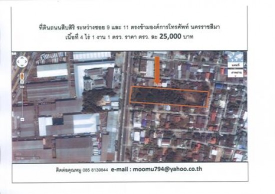 ขายที่ดิน 4 ไร่ 1 งาน 1 ตรว. หน้ากว้าง 40 เมตร ลึก 173.6 เมตร บนถนนสืบศิริระหว่างซอย 7 และซอย 9 ตรว. ละ 25000 ตรงข้ามองค์การโทรศัพท์ ติดต่อหมู 085813984 e-mail : [email protected]