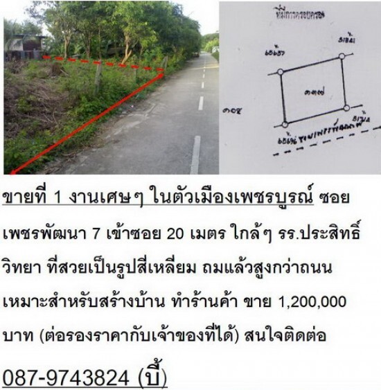 ขายที่ 1 งานเศษๆ ในตัวเมืองเพชรบูรณ์ ซอยเพชรพัฒนา 7 เข้าซอย 20 เมตร ใกล้ๆ รร.ประสิทธิ์วิทยา ที่สวยเป็นรูปสี่เหลี่ยม ถมแล้วสูงกว่าถนน เหมาะสำหรับสร้างบ้าน ทำร้านค้า ขาย 1,200,000 บาท (ต่อรองราคากับเจ้าของที่ได้) สนใจติดต่อ 087-9743824 (บี้)