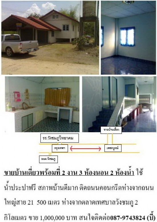 ขายบ้านเดี่ยวพร้อมที่ 2 งาน 3 ห้องนอน 2 ห้องน้ำ ใช้น้ำประปาฟรี สภาพบ้านดีมาก ติดถนนคอนกรีตห่างจากถนนใหญ่สาย 21 500 เมตร ห่างจากตลาดเทศบาลวังชมภู 2 กิโลเมตร ขาย 1,000,000 บาท สนใจติดต่อ087-9743824 (บี้)
