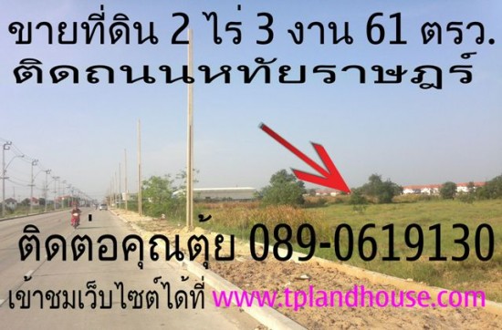 ขายที่ดิน 2 ไร่ 3 งาน 61 ตารางวา ติิดถนนหทัยราษฎร์ ถนนกว้าง 4 เลน ที่ดินหน้ากว้างประมาณ 40 * 120 เมตร ขายตารางวาละ 39,000 - ที่ดินเหมาะสำหรับทำโกดังเก็บของ, ที่ดินตั้งอยู่ถนนหทัยราษฏร์ เขตคลองสามวา กรุงเทพฯ การเดินทางสะดวกมีรถเมล์,รถตู้,รถสองแถวผ่าน สามารถออกถนนสุขาภิบาล 5 ถนนสายไหม,ถนนลำลูกกา ,ถนนนิมิตรใหม่,ถนนเลียบคลองสิบสอง(ซอยวัดคู้บอล) ใกล้ตลาดวัดหนองใหญ่,ตลาดหทัยมิตรถนนหทัยราษฏร์,ห้างบิ๊กซีเลียบคลองสิบสอง สนใจติดต่อสอบถามได้ที่คุณ อำนาจ 085-1946234 หรือคุณธีรภัทร (ตุ้ย) 089-0619130 หรือเข้าชมเว็บไซต์ได้ที่ http://www.tplandhouse.com