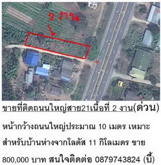 ขายที่ติดถนนใหญ่สาย21เนื้อที่ 2 งาน(ด่วน) หน้ากว้างถนนใหญ่ประมาณ 10 เมตร เหมาะสำหรับบ้านห่างจากโลตัส 11 กิโลเมตร ขาย 800,000 บาท สนใจติดต่อ 0879743824 (บี้)