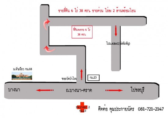 ขายที่ดินสวย 6 ไร่ 38 ตร.วา ถนนบางนา-ตราด กม.23 จากถนนบางนาตราด เข้าซอยไม่ลึก ต้องการขายไร่ละ 2 ล้านบาท พร้อมโอนได้ทันที สอบถามรายละเอียดเพิ่มเติม ติดต่อ คุณ ประกายฉัตร ( 081-7212147