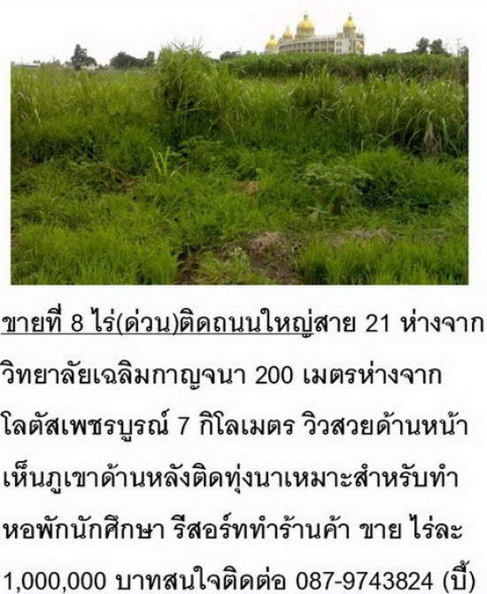 ขายที่ 8 ไร่(ด่วน)ติดถนนใหญ่สาย 21 ห่างจากวิทยาลัยเฉลิมกาญจนา 200 เมตรห่างจากโลตัสเพชรบูรณ์ 7 กิโลเมตร วิวสวยด้านหน้าเห็นภูเขาด้านหลังติดทุ่งนาเหมาะสำหรับทำหอพักนักศึกษา รีสอร์ททำร้านค้า ขาย ไร่ละ 1,000,000 บาทสนใจติดต่อ 087-9743824 (บี้)