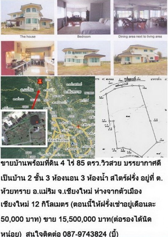 ขายบ้านพร้อมที่ดิน 4 ไร่ 85 ตรว.วิวสวย บรรยากาศดี เป็นบ้าน 2 ชั้น 3 ห้องนอน 3 ห้องน้ำ สไตร์ฝรั่ง อยู่ที่ ต.ห้วยทราย อ.แม่ริม จ.เชียงใหม่ ห่างจากตัวเมืองเชียงใหม่ 12 กิโลเมตร (ตอนนี้ให้ฝรั่งเช่าอยู่เดือนละ 50,000 บาท) ขาย 15,500,000 บาท(ต่อรองได้นิดหน่อย) สนใจติดต่อ 087-9743824 (บี้)