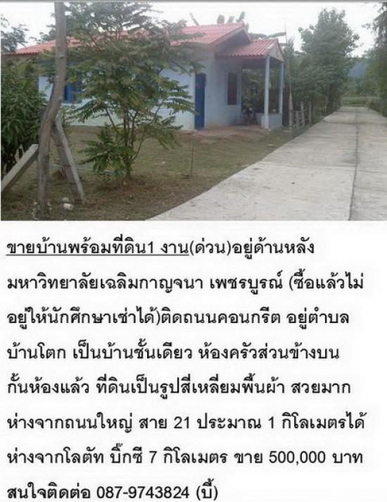 ขายบ้านพร้อมที่ดิน1 งาน(ด่วน)อยู่ด้านหลังมหาวิทยาลัยเฉลิมกาญจนา เพชรบูรณ์ (ซื้อแล้วไม่อยู่ให้นักศึกษาเช่าได้)ติดถนนคอนกรีต อยู่ตำบลบ้านโตก เป็นบ้านชั้นเดียว ห้องครัวส่วนข้างบนกั้นห้องแล้ว ที่ดินเป็นรูปสี่เหลี่ยมพื้นผ้า สวยมาก ห่างจากถนนใหญ่ สาย 21 ประมาณ 1 กิโลเมตรได้ ห่างจากโลตัท บิ๊กซี 7 กิโลเมตร ขาย 500,000 บาท สนใจติดต่อ 087-9743824 (บี้)
