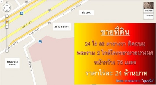 ขายที่ดิน 24 ไร่ 88 ตารางวา ติดถนนพระราม2 ใกล้โรงพยายาบาลบางมด หน้ากว้าง 75 เมตร