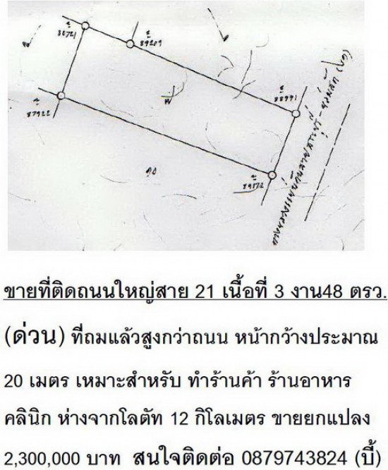 ขายที่ติดถนนใหญ่สาย 21 เนื้อที่ 3 งาน48 ตรว.(ด่วน) ที่ถมแล้วสูงกว่าถนน หน้ากว้างประมาณ 20 เมตร เหมาะสำหรับ ทำร้านค้า ร้า
