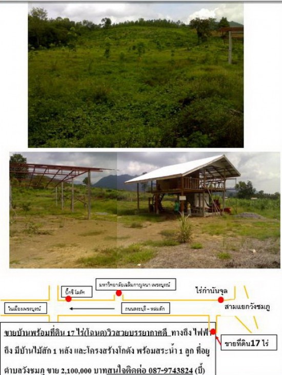 ขายบ้านพร้อมที่ดิน 17 ไร่(โฉนด)วิวสวยบรรยากาศดี ทางถึง ไฟฟ้าถึง มีบ้านไม้สัก 1 หลัง และโครงสร้างโกดัง พร้อมสระน้ำ 1 ลูก ที่อยูตำบลวังชมภู ขาย 2,100,000 (ร้อนเงินครับ)บาทสนใจติดต่อ 087-9743824 (บี้)