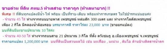 - จำนวน 40-50 ไร่ ห่างจากถนนสาย 21 ประมาณ 3 กิโล ที่ตั้ง ตวังชมภู อ.เมืองเพชรบูรณ์ จ.เพชรบูรณ์ ราคายกแปลง 1,200,000 บาท บนที่ดินเป็นสวนผลไม้ เช่น มะเฟือง , มะม่วง , ส้มโอ ด้านข้างติดธารน้ำตก