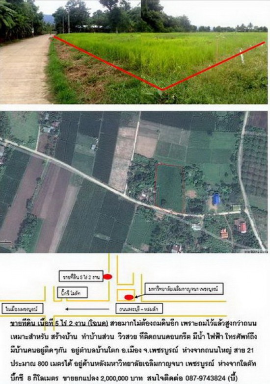 ขายที่ดิน เนื้อที่ 5 ไร่ 2 งาน (โฉนด) สวยมากไม่ต้องถมดินอีก เพราะถมไว้แล้วสูงกว่าถนน เหมาะสำหรับ สร้างบ้าน ทำบ้านส่วน วิวสวย ที่ติดถนนคอนกรีต มีน้ำ ไฟฟ้า โทรศัพท์ถึง มีบ้านคนอยู่ติดๆกัน อยู่ตำบลบ้านโตก อ.เมือง จ.เพชรบูรณ์ ห่างจากถนนใหญ่ สาย 21 ประมาณ 800 เมตรได้ อยู่ด้านหลังมหาวิทยาลัยเฉลิมกาญจนา เพชรบูรณ์ ห่างจากโลตัท บิ๊กซี 8 กิโลเมตร ขายยกแปลง 2,000,000 บาท สนใจติดต่อ 087-9743824 (บี้)