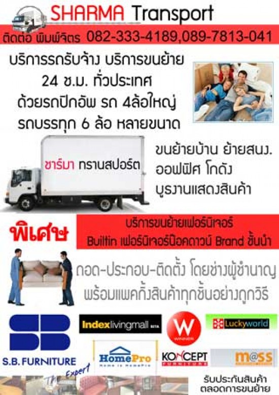 | ติดต่อ: | ชาร์มาทรานสปอร์ต บริการรถรับจ้าง บริการขนย้าย 24 ชั่วโมง | อีเมล์: | |