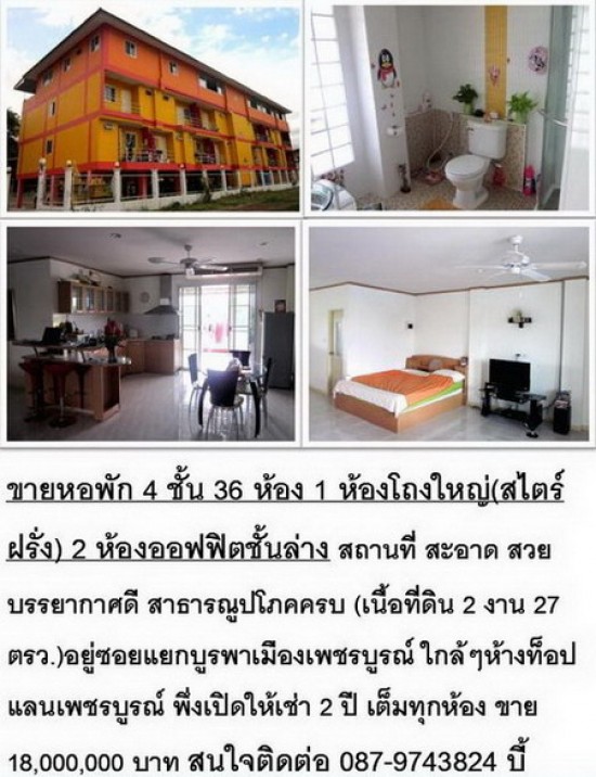 ขายหอพัก 4 ชั้น 36 ห้อง 1 ห้องโถงใหญ่(สไตร์ฝรั่ง) 2 ห้องออฟฟิตชั้นล่าง สถานที่ สะอาด สวยบรรยากาศดี สาธารณูปโภคครบ (เนื้อที่ดิน 2 งาน 27 ตรว.)อยู่ซอยแยกบูรพาเมืองเพชรบูรณ์ ใกล้ๆห้างท็อปแลนเพชรบูรณ์ พึ่งเปิดให้เช่า 2 ปี เต็มทุกห้อง ขาย 18,000,000 บาท(ราคาประเมินธนาคารประมาณ 10 ล้าน) สนใจติดต่อ 087-9743824 บี้