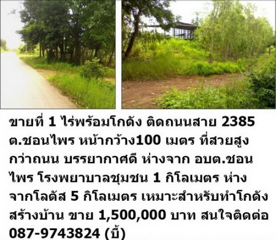 ขายที่ 1 ไร่พร้อมโกดัง ติดถนนสาย 2385 ต.ชอนไพร หน้ากว้าง100 เมตร ที่สวยสูงกว่าถนน บรรยากาศดี ห่างจาก อบต.ชอนไพร โรงพยาบาลชุมชน 1 กิโลเมตร ห่างจากโลตัส 5 กิโลเมตร เหมาะสำหรับทำโกดัง สร้างบ้าน ขาย 1,500,000 บาท สนใจติดต่อ 087-9743824 (บี้)