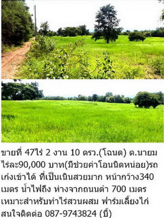 ขายที่ 47ไร่ 2 งาน 10 ตรว.(โฉนด) ต.นายม ไร่ละ90,000 บาท(มีช่วยค่าโอนนิดหน่อย)รถเก๋งเข้าได้ ที่เป็นเนินสวยมาก หน้ากว้าง340 เมตร น้ำไฟถึง ห่างจากถนนดำสาย2385 700 เมตร เหมาะสำหรับทำไร่สวนผสม ฟาร์มเลี้ยงไก่ สนใจติดต่อ 087-9743824 (บี้) http://www.facebook.com/prokumphaphun
