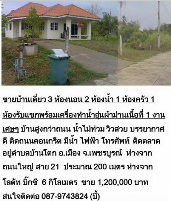 ขายบ้านเดี่ยว 3 ห้องนอน 2 ห้องน้ำ 1 ห้องครัว 1 ห้องรับแขกพร้อมเครื่องทำน้ำอุ่นผ้าม่านเนื้อที่ 1 งานเศษๆ บ้านสูงกว่าถนน น้ำไม่ท่วม วิวสวย บรรยากาศดี ติดถนนคอนกรีต มีน้ำ ไฟฟ้า โทรศัพท์ ติดตลาด อยู่ตำบลบ้านโตก อ.เมือง จ.เพชรบูรณ์ ห่างจากถนนใหญ่ สาย 21 ประมาณ 200 เมตร ห่างจากโลตัท บิ๊กซี 6 กิโลเมตร ขาย 1,200,000 บาท สนใจติดต่อ 087-9743824 (บี้) http://www.facebook.com/prokumphaphun
