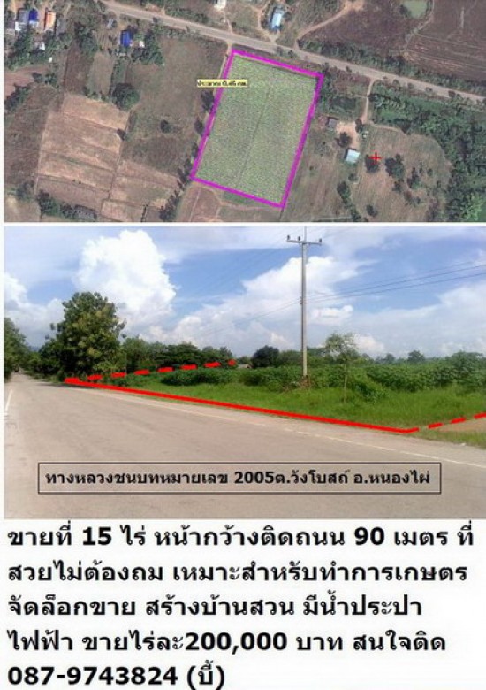 ขายที่ 15 ไร่ ต.วังโบสถ์ อ.หนองไผ่ หน้ากว้างติดถนน 90 เมตร ที่สวยไม่ต้องถม เหมาะสำหรับทำการเกษตร จัดล็อกขาย สร้างบ้านสวน มีน้ำประปา ไฟฟ้า ขายไร่ละ200,000 บาท สนใจติด087-9743824 (บี้)