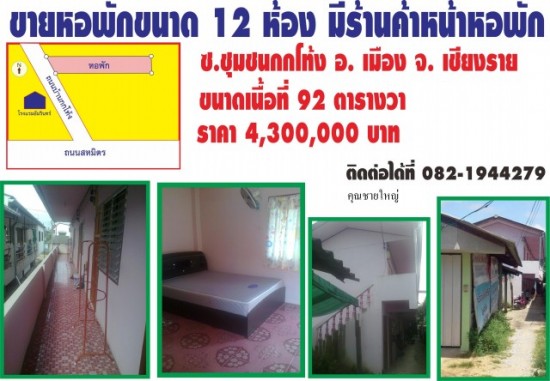ขายห้องพัก ขนาด12ห้อง มีร้านค้าหน้าห้องพัก ในเมืองเชียงราย ขนาด 92 ตารางวา ราคา 4.5ล้าน