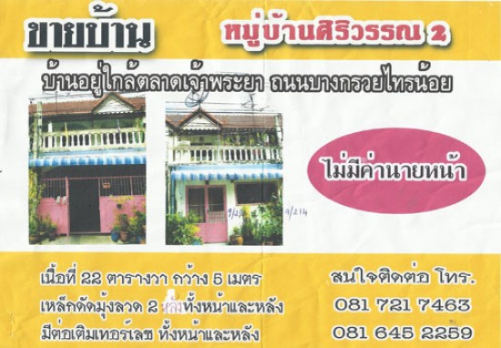 2 ห้องนอน 2 ห้องน้ำ 1 ห้องรับแขก อยู่หมู่บ้านศิริวรรณ 2 ใกล้ตลาดเจ้าพระยา ถนนบางกรวย-ไทรน้อย นนทบุรี เดินทางสะดวก