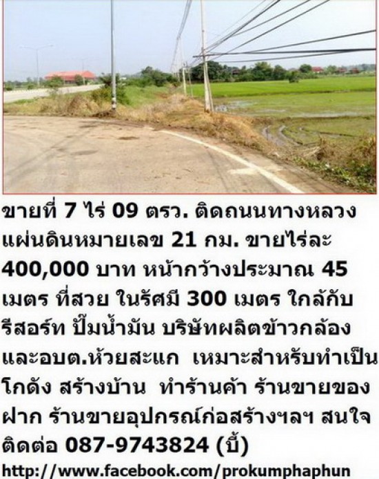 ขายที่ 7 ไร่ 09 ตรว. ติดถนนทางหลวงแผ่นดินหมายเลข 21 กม. ขายไร่ละ 400,000 บาท