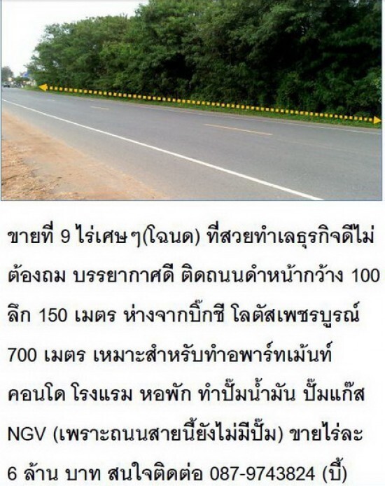 ขายที่ 9 ไร่เศษๆ(โฉนด) ที่สวยทำเลธุรกิจดีไม่ต้องถม บรรยากาศดี ติดถนนดำหน้ากว้าง 100 ลึก 150 เมตร ห่างจากบิ๊กชี โลตัสเพชรบูรณ์ 700 เมตร เหมาะสำหรับทำอพาร์ทเม้นท์ คอนโด โรงแรม หอพัก ทำปั๊มน้ำมัน ปั๊มแก๊สNGV (เพราะถนนสายนี้ยังไม่มีปั๊ม) ขายไร่ละ 6 ล้าน บาท สนใจติดต่อ 087-9743824 (บี้)
