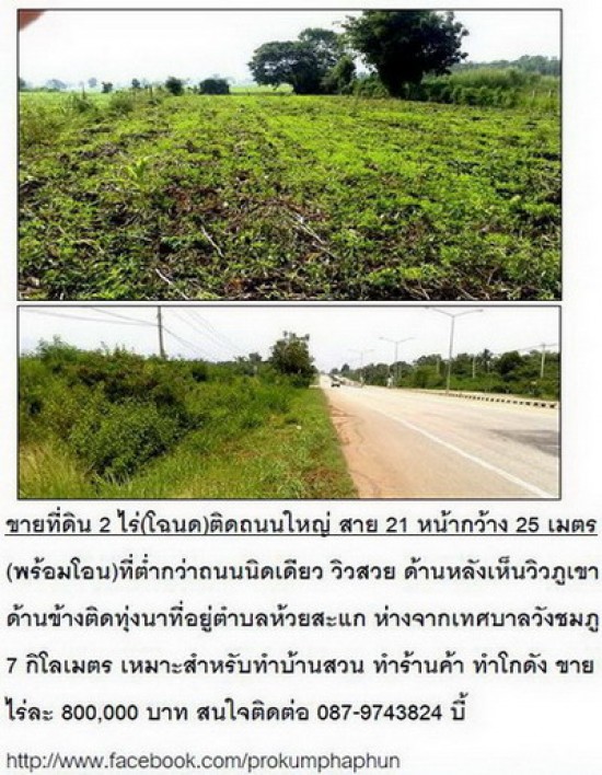 ขายที่ดิน 2 ไร่(โฉนด)ติดถนนใหญ่ สาย 21 หน้ากว้าง 25 เมตร (พร้อมโอน)ที่ต่ำกว่าถนนนิดเดียว วิวสวย ด้านหลังเห็นวิวภูเขา ด้านข้างติดทุ่งนาที่อยู่ตำบลห้วยสะแก ห่างจากเทศบาลวังชมภู 7 กิโลเมตร เหมาะสำหรับทำบ้านสวน ทำร้านค้า ทำโกดัง ขายไร่ละ 800,000 บาท สนใจติดต่อ 087-9743824 บี้ http://www.facebook.com/prokumphaphun