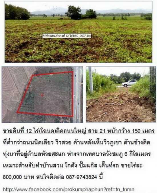 ขายดินที่ 12 ไร่(โฉนด)ติดถนนใหญ่ สาย 21 หน้ากว้าง 150 เมตร ที่ต่ำกว่าถนนนิดเดียว วิวสวย ด้านหลังเห็นวิวภูเขา ด้านข้างติดทุ่งนาที่อยู่ตำบลห้วยสะแก ห่างจากเทศบาลวังชมภู 6 กิโลเมตร เหมาะสำหรับทำบ้านสวน โกดัง ปั๊มแก๊ส เต็นท์รถ ขายไร่ละ 800,000 บาท สนใจติดต่อ 087-9743824 บี้ http://www.facebook.com/prokumphaphun?ref=tn_tnmn