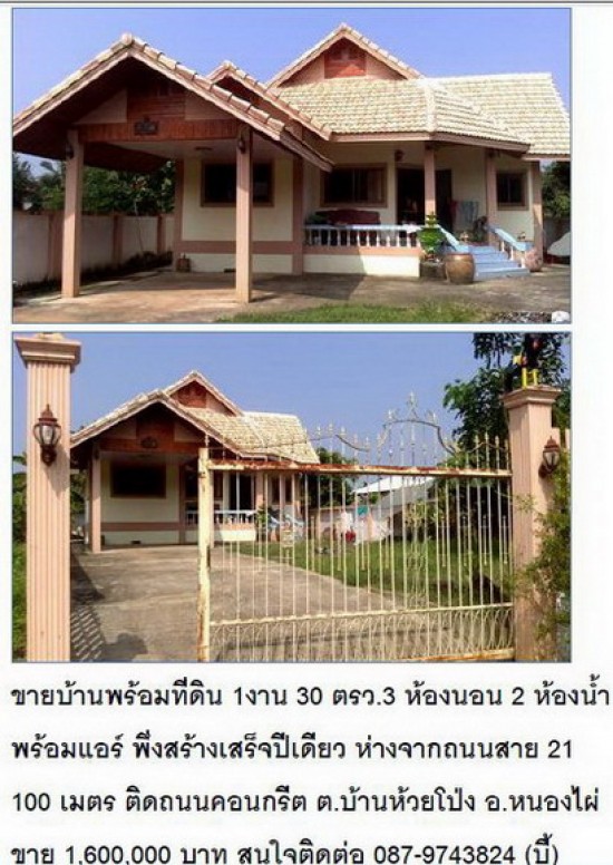 ขายบ้านพร้อมที่ดิน 1งาน 30 ตรว. (เจ้าของร้อนเงิน) 3 ห้องนอน 2 ห้องน้ำพร้อมแอร์ พึ่งสร้างเสร็จปีเดียว มีรั่วรอบขอบชิน ห่างจากถนนสาย 21 100 เมตร ติดถนนคอนกรีต ต.บ้านห้วยโป่ง อ.หนองไผ่ ขาย 1,600,000 บาท (ต่อรองราคาได้) สนใจติดต่อ 087-9743824 (บี้)