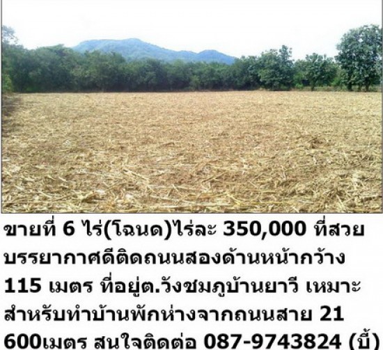 ขายที่ 6 ไร่(โฉนด)ไร่ละ 350,000 ที่สวยบรรยากาศดีติดถนนสองด้านหน้ากว้าง 115 เมตร ที่อยู่ต.วังชมภูบ้านยาวี เหมาะสาหรับทาบ้านพักห่างจากถนนสาย 21 600เมตร สนใจติดต่อ 087-9743824 (บี้)