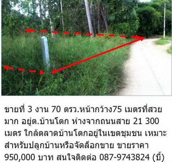 ขายที่ 3 งาน 70 ตรว.หน้ากว้าง75 เมตรที่สวยมาก อยู่ต.บ้านโตก ห่างจากถนนสาย 21 300 เมตร ห่างจากโลตัส บิ๊กซี 5 กิโลเมตร ใกล้ตลาดบ้านโตกอยู่ในเขตชุมชน เหมาะสาหรับปลูกบ้านหรือจัดล็อกขาย ขายราคา 950,000 บาท สนใจติดต่อ 087-9743824 (บี้) http://www.facebook.com/prokumphaphun