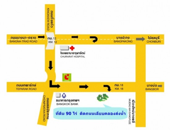 ***ที่ดินสวย ถมแล้ว เนื้อที่ 90 ไร่ อยู่ถนนเทพารักษ์ กม.18 ติดถนนเลียบคลองส่งน้ำ