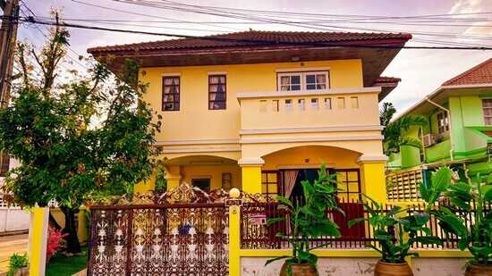 - ภายนอกบ้านสีเหลืองสดใสโดดเด่น