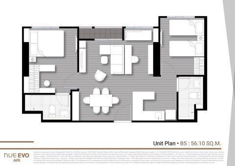 ชั้น 16 ตำแหน่ง B5 ห้องหัวมุม ขนาด 56.10 ตารางเมตร